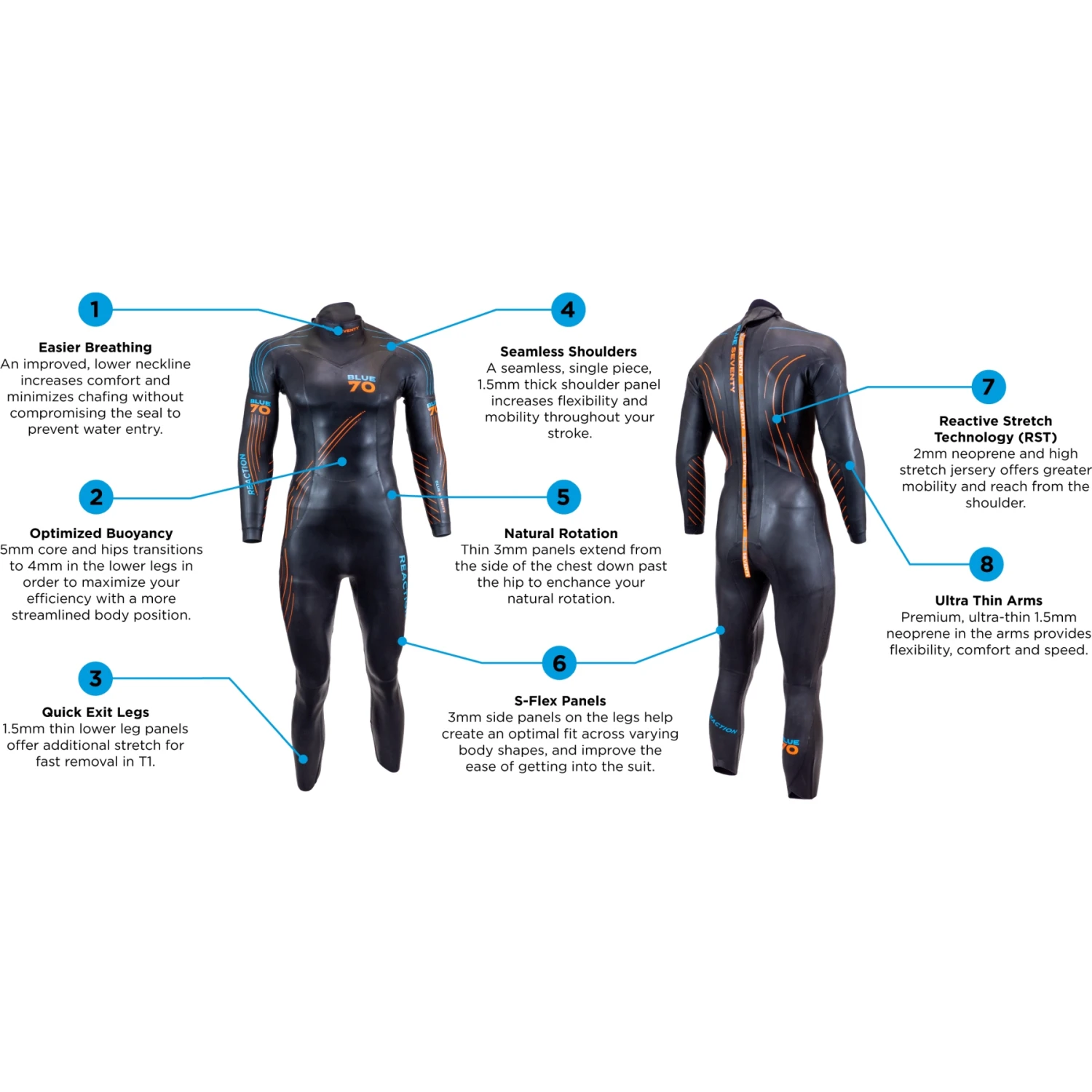 - blueseventy heeft de omvang van de polsmanchetten verkleind om het in- en uitstappen te vergemakkelijken, vooral bij het dragen van een groot horloge. Met de snelle uitstapbenen kunt u het pak afduwen voor snellere wisseltijden.